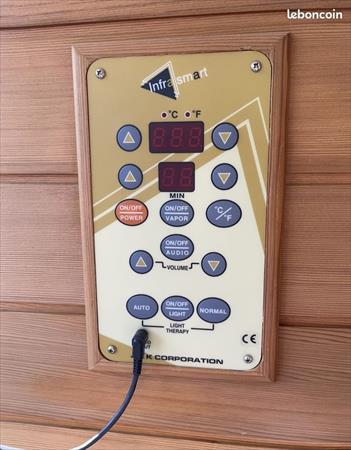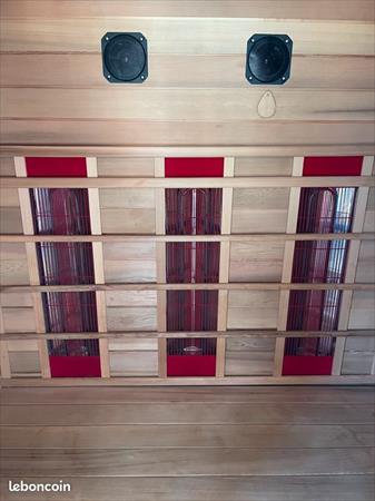 Cabine infrarouge en bois de cèdre rouge , élément de chauffage Incoloy, haut parleurs Photo thérapie , aromathérapie, ciel lumineux entrée audio MP3 . 5 plaques de chauffe . Dimensions 140x100x185 entièrement démontable et facile à installer .