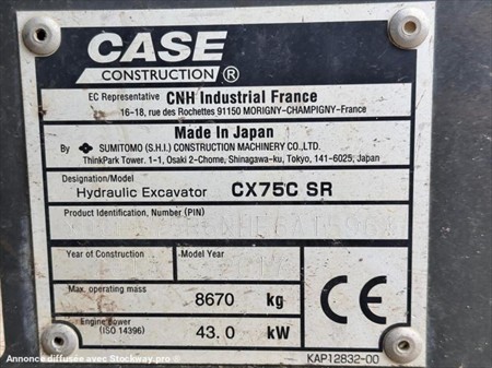 Pelle à chenilles 8,5T Case CX75C SR Année 2017 - 4015 heures évolutives N° de série DCH075R6NHE6A1596 Poids 8670Kg 3 Godets : Curage orientable + Terrassement + Tranchée Attache rapide hydraulique Chenilles neuves Largeur chenilles 450mm Dimensions : Long 5,75m x larg 2,35m x Haut 2,80m Moteur ISUZU AP-4LE2X 2.179L Puissance 43kW / 58cv Tier 4 Final / Stage III B Lors de sa réception, un employé qualifié de DB EQUIPMENT a effectué un contrôle des éléments essentiels du matériel, et a pu constater : son bon fonctionnement général, machine prête à travailler. Ce matériel est disponible sur parc, et peut être essayé sur nos horaires d'ouverture sur simple rendez-vous. REPRISE ET LIVRAISON POSSIBLE Nous nous efforçons de publier des informations les plus précises possibles mais aucun droit ne peut être tiré des textes publiés.