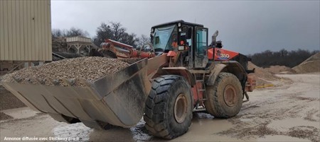 Chargeuse sur pneus HITACHI type ZW310-6 Année : 2017 Heures : 12900 Poids : 28 t Graissage centralisé - Pesage ASCOREL Pneumatiques : 26.5 R 25 Longueur en transport : 9.185 m Largeur en transport : 2.98 m Hauteur en transport : 3.53 m Hauteur max. de déversement : 2.995 m Moteur Cummins QSL9 (225 kW) Godet à dents de 4.3 m³
