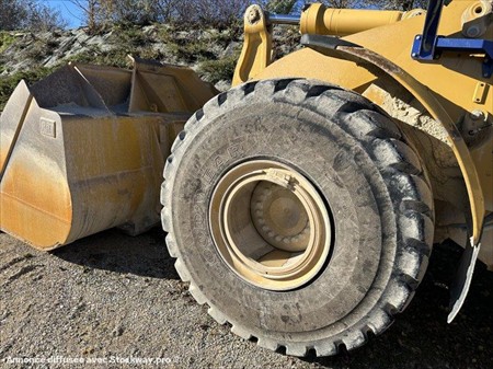 Chargeuse sur pneus CATERPILLAR type 966M XE Année : 2016 Heures : 15000 Poids : 24 t - Largeur en transport : 2.991 m Graissage centralisé Moteur Caterpillar C9.3 Acert (222 kW) Pneus Goodyear 26.5R25 GP-40 Godet renforcé à dents (Capacité du godet : 4.4 m³)
