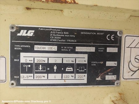 Marque JLG Modèle TOUCAN 10E-L Sous-catégorie Nacelles verticales Motorisation Électrique Capacité 200 kg Hauteur de travail 10,1 m Année de fabrication 2020 Horamètre 257 h