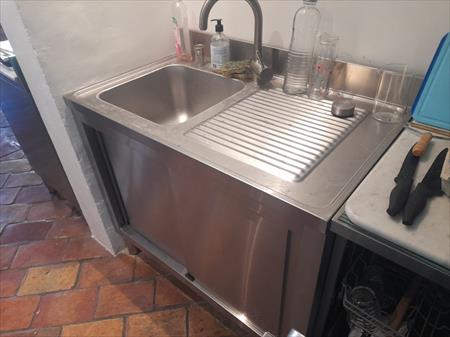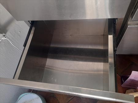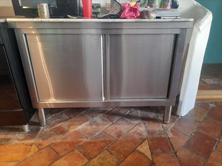 - 1 grand rangement (120 cm de longueur / 50 cm de profondeur / 86 cm de hauteur). Sur ce meuble a tiroir coulissant, le papier protecteur a été laissé pour ne pas abimé l'inox --> neuf