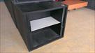 Petite armoire métallique monobloc de couleur noire (hauteur de bureau). Fermeture par une double porte à rideau en PVC.