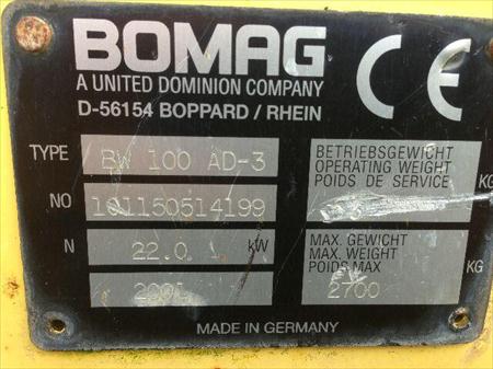 Rouleau compacteur articulé BOMAG BW100 en bon état année 2001 et 2144 heures, poids 2700kg, entretien éffectué, livraison possible, prix HT.