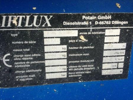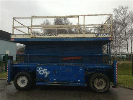Nacelle ciseaux LIFTLUX SL205/25 en bon état, année 2002 et 4115 heures, hauteur de travail 22.5 métres, pneus remplissage mousse, capacité 1000kg, extension hydraulique 1.90 métres, VGP et entretien éffectués, livraison possible, prix HT.