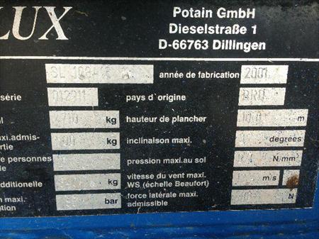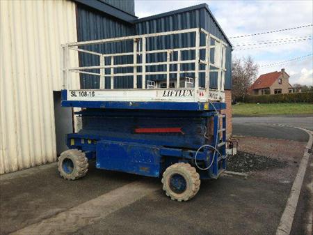 Nacelle ciseaux liftlux SL108-16 en trés bon état, année 2001 et 890 heures, hauteur de travail 12.8M, capacité 500kg, extension manuelle 1.40M, pneus non marquants, entretien et VGP éffectués, livraison possible, prix HT.